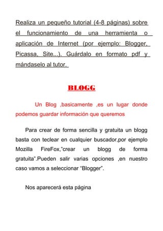 Este documento proporciona un pequeño tutorial de 4-8 páginas sobre cómo crear y usar un blog en Blogger. Explica que un blog es un lugar para almacenar información que se quiere compartir y cómo crear uno gratis en Blogger usando una cuenta de Gmail. También describe las plantillas, páginas, seguidores y comentarios que ofrece Blogger para personalizar y compartir contenido en el blog.