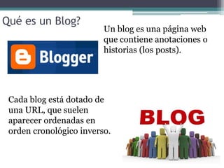 Un blog es una página web que contiene entradas o historias ordenadas de forma cronológica inversa. Los blogs permiten agrupar entradas por categorías y cubren una variedad de temas como periodismo, tecnología y educación. Los blogs modernos evolucionaron de diarios en línea anteriores y forman parte de una red dinámica y en constante construcción.