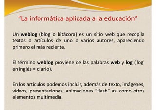 Este documento habla sobre los blogs y la plataforma Blogger. Explica que un blog es un sitio web que recopila artículos de uno o más autores, mostrando primero el más reciente. Luego describe que Blogger y WordPress son las plataformas más populares para crear blogs online. Finalmente, detalla los pasos para crear una cuenta en Blogger y un blog nuevo, incluyendo la configuración y selección de una plantilla.