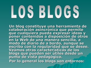 Los blogs permiten que cualquier persona publique contenido en la web de forma sencilla y asincrónica como un diario. Generalmente los blogs son colaborativos, permitiendo comentarios, interactivos al enlazar otros contenidos, y gratuitos. Los blogs son útiles para fines educativos al permitir la participación limitada de estudiantes y el acceso a varios recursos.