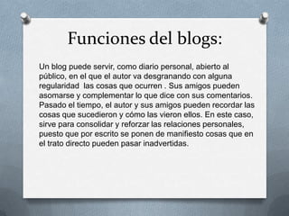 Un blog es una publicación online con historias presentadas en orden cronológico inverso. Los blogs suelen incluir enlaces a otros blogs y sistemas de comentarios para conversaciones. Se usan blogs para diarios personales, promoción personal, y columnas de opinión.