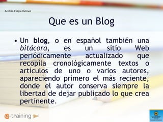 Este documento define qué es un blog y describe sus características principales. Un blog es un sitio web actualizado periódicamente que recopila artículos de uno o más autores en orden cronológico inverso. Los blogs pueden ser personales, temáticos o empresariales. Algunas características clave de los blogs incluyen la clasificación de contenido por fecha, categorías y etiquetas, la capacidad de publicar enlaces y publicidad, y la facilidad de actualización y edición.