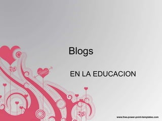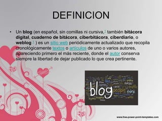 Este documento describe los blogs y su uso en la educación. Define un blog como un sitio web actualizado periódicamente que recopila cronológicamente artículos de uno o más autores. Explica que los blogs ofrecen ventajas educativas como estimular la escritura, el intercambio de ideas y el trabajo en equipo de los estudiantes. También permite a los docentes acercarse a los estudiantes de nuevas maneras y publicar materiales de forma inmediata.