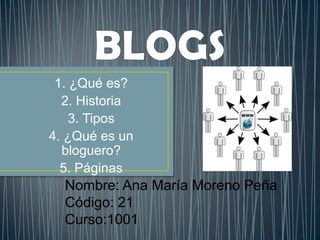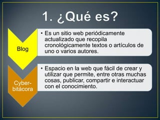 El documento habla sobre los blogs. Explica que un blog es un sitio web actualizado periódicamente que recopila cronológicamente textos o artículos de uno o más autores. Luego describe brevemente la historia de los blogs desde 1994 hasta el presente, señalando algunos hitos importantes como el aumento de su popularidad y su uso por celebridades. Finalmente, define un bloguero como la persona o grupo de personas que redactan y diseñan sitios web para divulgar sus ideas o gustos en internet.