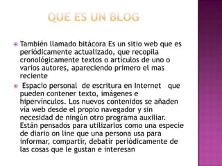 Los blogs son sitios web actualizados periódicamente que recopilan cronológicamente textos o artículos de uno o más autores. Son espacios personales de escritura en internet donde se pueden agregar texto, imágenes e hipervínculos. Existen blogs personales, temáticos y corporativos.