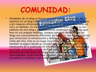 Este documento describe la historia y naturaleza de los blogs. Explica que los blogs se hicieron populares a finales de los años 90 y principios de los 2000, pero no se expandieron ampliamente en el mundo hispanohablante hasta 2005. Los blogs atraen comunidades de lectores con intereses similares y fomentan debates. Los creadores de blogs actúan como filtros para temas de interés y enlazan a otros sitios. Crear un blog básico es sencillo, pero hacer uno bueno requiere conocimiento y talento. Los blogs crean rel