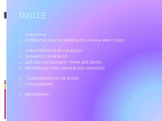 Este documento describe las características de los blogs, incluyendo sus elementos, programas para crear blogs gratuitos y curiosidades sobre blogs. Explica las diferencias entre blogs, páginas web y foros. Los blogs permiten a autores publicar periódicamente sobre varios temas y permiten comentarios, mientras que los foros fomentan la discusión entre usuarios. Los gadgets agregan funcionalidad a los blogs. Existen varios programas gratuitos para crear blogs como Windows Live Writer y Thingamablog.