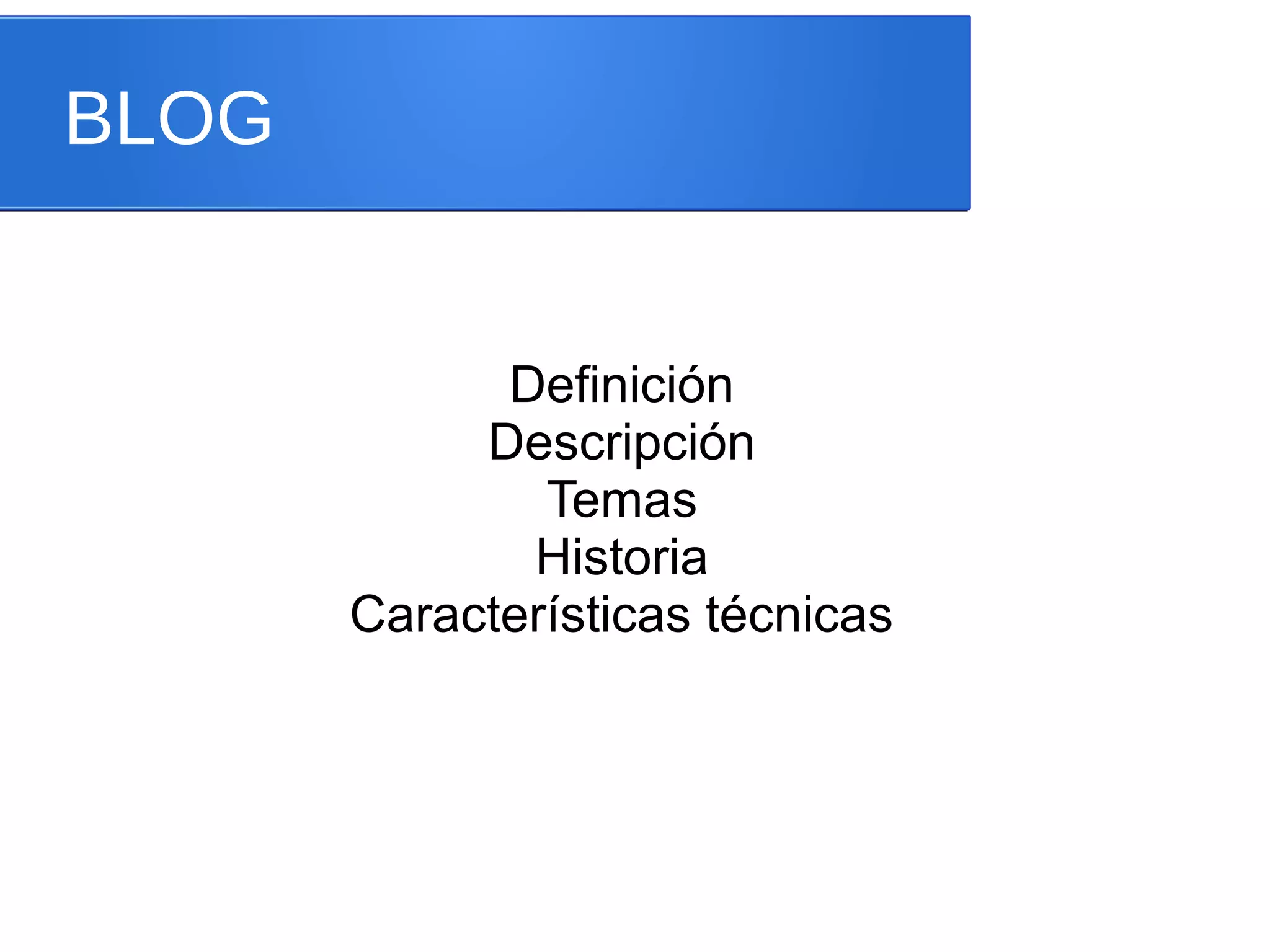 El documento define un blog como un sitio web en el que uno o más autores publican artículos de forma cronológica. Los blogs permiten a los lectores comentar y participar en diálogos, aunque el autor controla esto. Los blogs cubren una variedad de temas y surgieron en la década de 1990 como diarios en línea personales. En la actualidad, los blogs son uno de los servicios más populares de Internet y permiten funciones como comentarios, enlaces e imágenes.