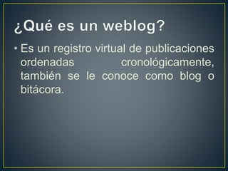 Este documento describe las características y usos de los blogs. Un blog es un registro virtual de publicaciones ordenadas cronológicamente que sirve para realizar registros detallados de hechos, opiniones u otros textos de interés. Actualmente, los blogs se usan principalmente para educación, economía, política y compartir información sobre temas específicos.
