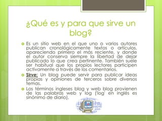 Este documento define qué es un blog y para qué sirve. Un blog es un sitio web donde uno o más autores publican artículos de forma cronológica para compartir ideas u opiniones sobre diversos temas. Los blogs permiten a los lectores comentar y participar activamente. También define qué es un bloguero como alguien que se dedica de forma relativamente profesional a desarrollar un blog sobre temas que les apasionan.