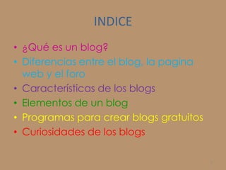 Este documento describe los blogs, incluyendo su definición como sitios web actualizados periódicamente que recopilan artículos de uno o más autores en orden cronológico inverso, las diferencias entre blogs, páginas web y foros, las características y elementos comunes de los blogs, programas gratuitos para crear blogs, y curiosidades sobre el crecimiento y uso de blogs.