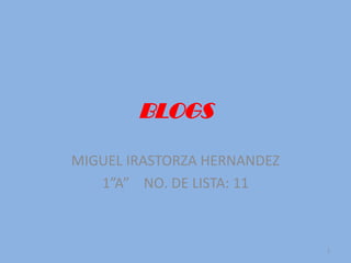 Este documento habla sobre los blogs, explicando que son sitios web actualizados periódicamente que recopilan artículos de uno o más autores de forma cronológica, y que permiten a los lectores comentar. También describe las diferencias entre blogs, páginas web y foros, así como características como su facilidad de creación y elementos como entradas y comentarios. Por último, menciona algunos programas gratuitos para crear blogs y curiosidades sobre su crecimiento.