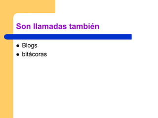Los blogs educativos tienen como objetivo apoyar el proceso de enseñanza y aprendizaje en un contexto educativo. Ofrecen ventajas como un fácil uso, acceso gratuito, autoría compartida y publicación cronológica. Los objetivos incluyen buscar, seleccionar, verificar y compartir información en Internet, así como desarrollar alfabetización digital a través de prácticas orientadas a proyectos con énfasis en los procesos de aprendizaje. El uso de blogs en la educación requiere tener objetivos claros