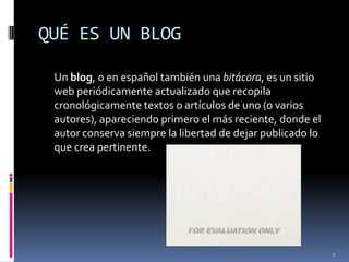 El documento describe los elementos básicos de un blog. Explica que un blog es un sitio web actualizado periódicamente por uno o más autores donde se publican artículos de forma cronológica. Un blog tiene una zona pública, accesible a todos, y una zona de administración privada. La zona pública incluye la columna principal con las entradas, la barra lateral y el encabezado y pie de página. La zona de administración permite gestionar el contenido, diseño y configuración del blog.