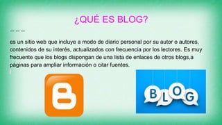 Un blog es un sitio web que funciona como un diario personal actualizado frecuentemente por su autor. Un blog se enfoca más en la interacción con los lectores, mientras que un sitio web contiene información más estática. Los blogs comparten contenido nuevo regularmente y tratan a todos los lectores de forma global.