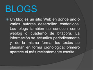 Este documento describe las características y usos de los blogs y dos populares herramientas para crear blogs: Blogger y WordPress. Los blogs permiten a los autores publicar contenido regularmente en forma cronológica y los lectores pueden comentar. Blogger y WordPress son fáciles de usar y gratuitos, aunque WordPress ofrece más flexibilidad y personalización.
