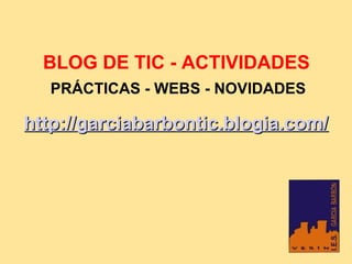 Este documento lista varios recursos en internet relacionados con tecnologías de la información y comunicación (TIC), incluyendo blogs del profesor y del aula de alumnos con actividades prácticas, novedades y material multimedia, así como una página web con recursos de utilidad.