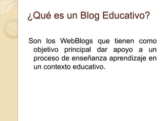 Un blog educativo es un sitio web cuyo objetivo principal es apoyar procesos de enseñanza y aprendizaje en un contexto educativo. Es útil para clases ya que permite debates, expresión, organización de contenidos y crea una comunidad de aprendizaje, además de ser beneficioso para profesores y alumnos al permitir reflexión, seguimiento del aprendizaje y publicación de materiales. Si bien son flexibles, gratuitos y fomentan la creatividad, su uso requiere acceso a Internet y tiempo para aprender a mane