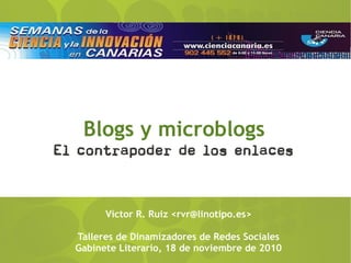 Este documento presenta una introducción a los blogs y microblogs. Explica brevemente la historia de los blogs, describiendo cómo han evolucionado de herramientas estáticas a plataformas dinámicas que permiten la interacción. También describe las principales herramientas de blogs y microblogs como Twitter, así como consejos para blogueros novatos sobre cómo construir una comunidad y mantener el compromiso. El documento tiene la intención de capacitar a los dinamizadores de redes sociales sobre cómo usar efectivamente los blogs y microblogs.