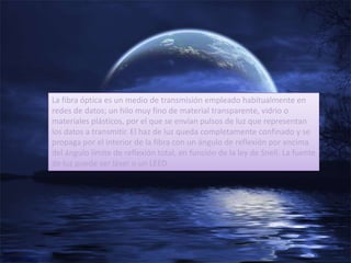 La fibra óptica transmite datos a través de hilos finos de vidrio u otros materiales transparentes mediante pulsos de luz. La luz se mantiene completamente dentro de la fibra a través de la reflexión total interna y puede provenir de un láser o un LED.