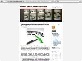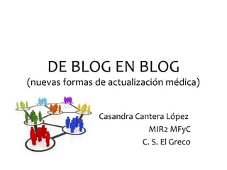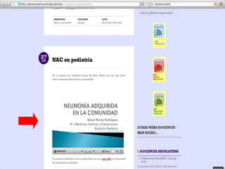 El documento habla sobre nuevas formas de actualización médica a través de blogs y agregadores de noticias. Explica que los blogs permiten compartir información, opiniones y novedades de forma accesible y en un formato cronológico inverso, mientras que los agregadores como Netvibes ofrecen una interfaz personalizada con módulos que recopilan noticias médicas a través de RSS para mantenerse actualizado. El objetivo general es facilitar el intercambio de conocimientos y la discusión entre profesionales.