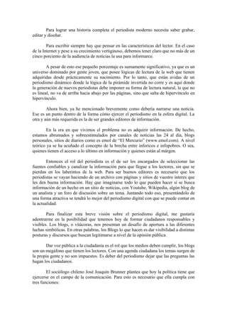 Este documento describe la evolución del periodismo hacia lo digital y la participación ciudadana a través de blogs. Explica que el periodismo digital ha empoderado a los lectores permitiéndoles debatir e influir en la agenda noticiosa. También destaca que los blogs son una herramienta para crear vínculos con las audiencias, especialmente los lectores más jóvenes, y atraer nuevas audiencias que antes no consumían noticias a través del periódico tradicional. Finalmente, enfatiza la importancia de fomentar debates de calidad