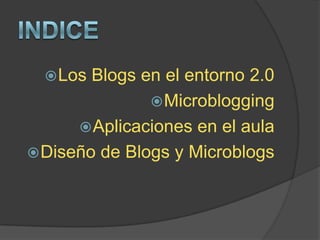 Este documento habla sobre blogs y microblogs como Twitter en el entorno web 2.0. Brevemente describe que los blogs establecieron los cimientos para compartir información y conversaciones en línea, y que Twitter permite enviar mensajes breves de hasta 140 caracteres que pueden ser leídos por otros y compartidos usando hashtags. Finalmente, discute algunas aplicaciones potenciales de blogs y Twitter en el aula.