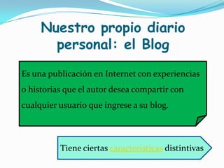 El documento describe las características de un blog personal, incluyendo que es una publicación en Internet donde el autor comparte experiencias o historias con usuarios, que las publicaciones aparecen en orden cronológico inverso, y que los lectores pueden dejar comentarios.