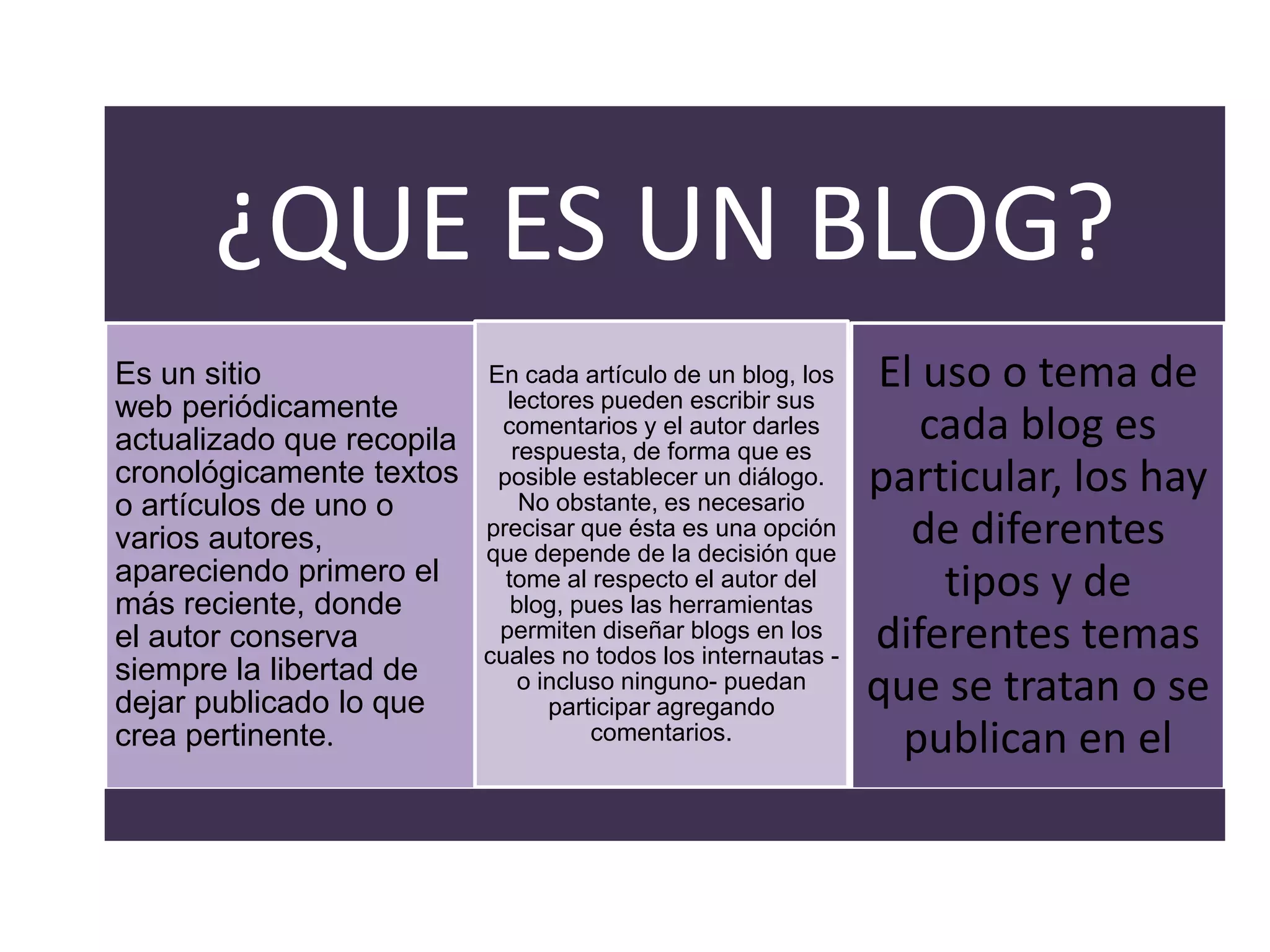 Un blog es un sitio web periódicamente actualizado que recopila cronológicamente artículos o textos de uno o más autores. Los lectores pueden comentar los artículos a menos que el autor lo prohíba. Los blogs cubren una variedad de temas y se han vuelto muy populares entre celebridades y empresas. Existen varias plataformas para crear blogs como Wordpress, Blogger y HazBlog.