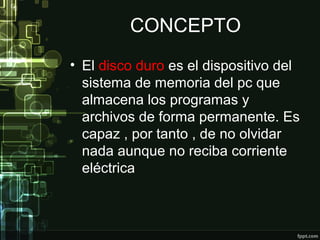 El documento describe la historia y el desarrollo del disco duro desde sus orígenes en las tarjetas perforadas hasta convertirse en el dispositivo de almacenamiento permanente principal en los ordenadores modernos. Explica que el primer disco duro fue la unidad de almacenamiento de la computadora IBM RAMAC 305 en 1956, mientras que el modelo IBM 3340 de 1973 es considerado el padre del disco duro moderno debido a su diseño de dos ejes independientes. Finalmente, detalla las mejoras de velocidad en la lectura de datos a lo largo de los