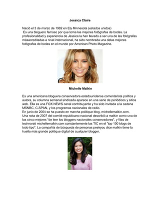 Este documento presenta información sobre cuatro blogueros destacados: Nir Ofir, quien propuso el Día Internacional del Blog y cofundó BlogTV; Jessica Claire, una fotógrafa de bodas reconocida internacionalmente; Michelle Malkin, una bloguera conservadora estadounidense que contribuye a Fox News y otros medios; y David Bravo Bueno, un abogado especializado en derecho informático que defiende el derecho a compartir cultura. También presenta información sobre María Victoria Gallerano, una bloguera argentina enfocada