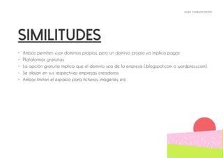 Este documento compara las plataformas Blogger y WordPress, destacando sus similitudes y diferencias. Ambas son plataformas gratuitas para blogs, pero Blogger es más sencilla de usar mientras que WordPress ofrece más funcionalidades y opciones de personalización. Blogger indexa contenido más rápido pero tiene menos funciones, mientras que WordPress requiere más conocimientos técnicos pero permite mayor control y versatilidad en diseño de sitios web.