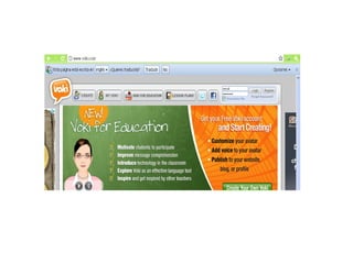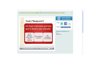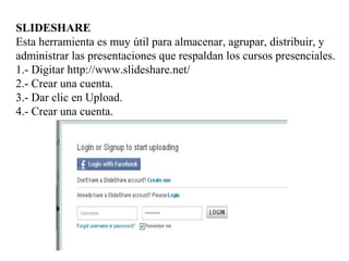 Las herramientas SlideShare, Voki y Prezi permiten crear y compartir presentaciones y contenidos multimedia de manera en línea. SlideShare permite subir presentaciones de diapositivas, Voki permite crear personajes animados para agregar voz a los contenidos, y Prezi ofrece un lienzo infinito para crear presentaciones no lineales con texto, imágenes y video.