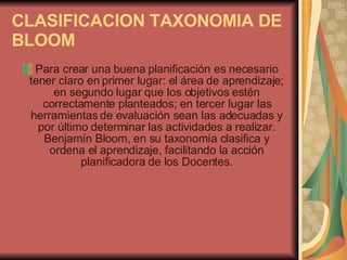 El documento describe la taxonomía de Bloom para la clasificación de objetivos educativos. La taxonomía incluye tres campos: cognitivo, psicomotor y afectivo. El campo cognitivo comprende seis categorías de conocimiento: conocimiento, comprensión, aplicación, análisis, síntesis y evaluación. El campo psicomotor se refiere a destrezas motrices. El campo afectivo clasifica objetivos en cinco niveles basados en el grado de interiorización de actitudes y valores.