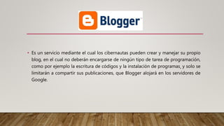 Blogger es un servicio gratuito de Google que permite a los usuarios crear y administrar fácilmente sus propios blogs sin necesidad de conocimientos de programación. Los blogs de Blogger se alojan en los servidores de Google y ofrecen características como plantillas personalizables, almacenamiento de imágenes y videos, y la capacidad de agregar otros usuarios como editores o administradores. Blogger brinda a los usuarios un espacio en línea para compartir opiniones y contenido de forma gratuita.