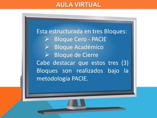 El documento describe la estructura de un aula virtual dividida en tres bloques: Bloque Cero - PACIE, Bloque Académico y Bloque de Cierre. El Bloque Académico contiene la información y contenidos de la asignatura, así como documentos, enlaces y una exposición temática para que los estudiantes aprendan de forma interactiva y personalizada. El Bloque Académico también se divide en cuatro secciones: Exposición de Información, Rebote, Construcción de Conocimiento y Comprobación.