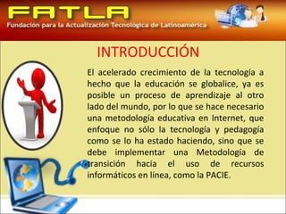 Este documento describe la Metodología PACIE, un enfoque para la transición hacia el aprendizaje en línea. La Metodología PACIE se compone de varias fases y estructura el aula virtual en tres bloques, con énfasis en el Bloque 0 o Bloque PACIE. El Bloque 0 busca motivar a los estudiantes y fomentar la interacción a través de secciones de información, comunicación e interacción.