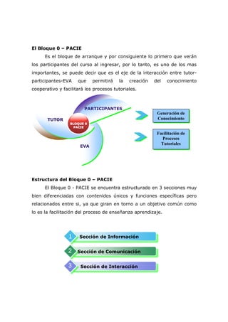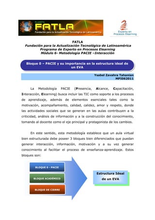 Este documento describe la Metodología PACIE, la cual busca incluir las TIC como soporte para el aprendizaje. Explica que un aula virtual debe tener 3 bloques: Bloque 0 - PACIE, Bloque Académico y Bloque de Cierre. El Bloque 0 - PACIE es el punto de partida y contiene 3 secciones: Información, Comunicación e Interacción. La sección de Información brinda detalles sobre el curso. La sección de Comunicación contiene una cartelera en línea. Y la sección de Interacción fom