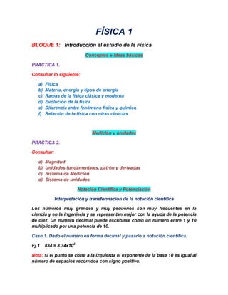 Este documento presenta una introducción al estudio de la física, incluyendo conceptos básicos como materia, energía y las ramas de la física clásica y moderna. Explica la importancia de la medición y las unidades, y cómo representar números grandes y pequeños en notación científica. Finalmente, cubre cómo convertir entre diferentes unidades, con ejemplos como convertir entre pies y yardas, metros y millas, y kilogramos y libras.