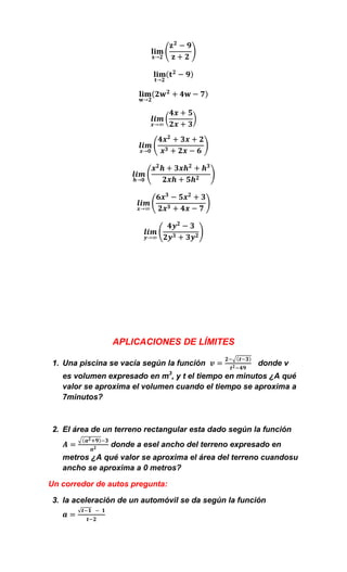 Este documento presenta una serie de problemas de cálculo que involucran inecuaciones, límites, y derivadas. Los problemas de inecuaciones piden resolver ecuaciones y graficar los intervalos resultantes. Los problemas de límites piden calcular el valor al que se aproxima una función cuando una variable se aproxima a cierto valor. Finalmente, los problemas de derivadas piden calcular la derivada de varias funciones.