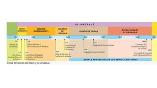 Este documento resume la historia de Al-Ándalus desde la conquista musulmana en el siglo VIII hasta el final del Reino Nazarí de Granada en 1492. Explica la evolución del emirato y califato de Córdoba, el periodo de los reinos de taifas, las intervenciones de los imperios almorávide y almohade del norte de África, y concluye describiendo brevemente la organización y caída del último estado musulmán en Granada.