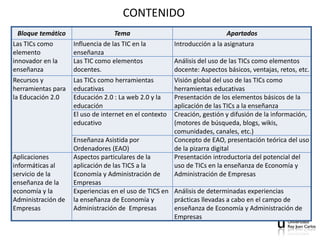 El documento presenta una introducción a las tecnologías de la información y la comunicación (TICs) aplicadas a la enseñanza. Explica que las TICs pueden influir positivamente en la enseñanza al ser utilizadas como herramientas docentes y educativas. Además, describe recursos clave como Internet, la web 2.0, la enseñanza asistida por ordenador y aplicaciones informáticas útiles para la enseñanza de la economía y la administración de empresas. Finalmente, el documento analiza experiencias prácticas del uso