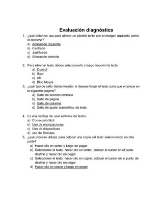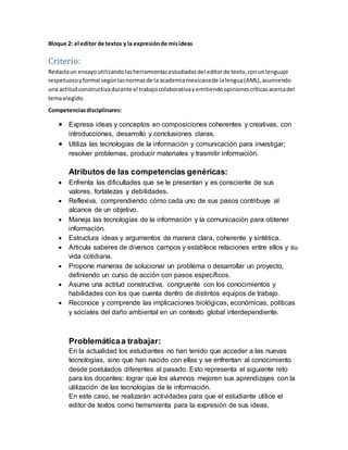 Este documento presenta las competencias y habilidades que los estudiantes deben desarrollar al redactar un ensayo utilizando las herramientas de un editor de texto. Los estudiantes aprenderán a expresar ideas de manera coherente y creativa siguiendo las normas de la Academia Mexicana de la Lengua, a trabajar de manera colaborativa y crítica, y a utilizar las tecnologías de información para investigar y comunicar. El documento también incluye una evaluación diagnóstica sobre el uso básico de las funciones de un