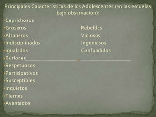El documento describe las características principales de los estudiantes de secundaria según diferentes fuentes. Algunos son caprichosos, rebeldes o ingeniosos, mientras que otros son respetuosos o participativos. El documento luego discute cuatro enfoques de enseñanza: ser estricto como Hitler, tradicional como el Abuelo, divertido como el Cuatacho, o tomar elementos de los tres para ser el Maestro Ideal.