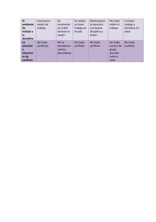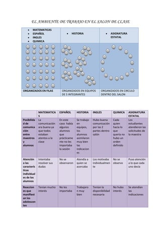 El documento describe el ambiente de trabajo en diferentes asignaturas en un salón de clases. En matemáticas y español los estudiantes estaban atentos y motivados, mientras que en historia trabajaron bien en equipos. En inglés hubo buena comunicación, y en química los estudiantes trabajaron de forma independiente. En la asignatura estatal los estudiantes prestaron atención a las indicaciones de la maestra.
