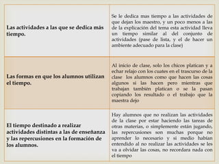 Las actividades a las que se dedica más tiempo son las actividades que dejan los maestros como tareas, y un poco menos tiempo a la explicación del tema. Los alumnos utilizan el tiempo al inicio platicando y bromeando, y durante la clase también platican mientras trabajan. Hay alumnos que no realizan las actividades de clase por estar haciendo tareas de otras materias o jugando, lo que tiene repercusiones como no aprender lo necesario y olvidar las cosas. Para lograr un uso efectivo del tiempo, los maestros deben monitorear a los