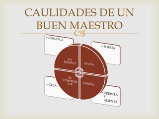 El documento describe el impacto que tienen los maestros en sus alumnos. Sus acciones y conducta total se proyectan a través de los estudiantes, no sólo en el aula sino también a través de la imitación inevitable. Lo mejor es que los maestros sean un ejemplo positivo para los estudiantes, inclinándolos a áreas específicas del saber a través de su conducta.