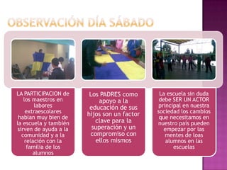 La participación de los padres en actividades extraescolares y el apoyo a la educación de sus hijos son factores clave para el éxito de los estudiantes y el compromiso de las familias con la escuela. Las escuelas deben desempeñar un papel principal en promover cambios positivos en la sociedad a través de la educación de los estudiantes.
