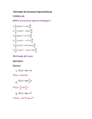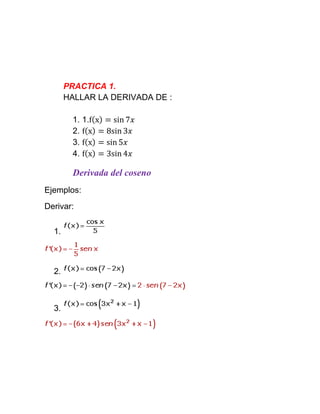 Este documento presenta fórmulas para derivar funciones trigonométricas como seno, coseno y tangente. Incluye ejemplos de derivadas de estas funciones y tres prácticas con ejercicios para hallar la derivada de funciones trigonométricas.