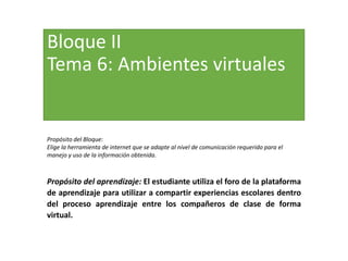 El documento describe diferentes tipos de ambientes virtuales para el aprendizaje, incluyendo plataformas de e-learning, blogs, wikis y redes sociales. Define cada uno y explica cómo pueden usarse con fines educativos, por ejemplo, para que los estudiantes compartan experiencias a través de foros o editen contenido de manera colaborativa en wikis. El propósito es familiarizar al estudiante con estas herramientas y cómo pueden facilitar el proceso de enseñanza y aprendizaje de forma virtual.